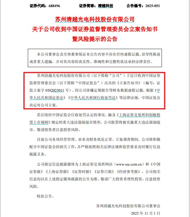 11月第一个交易日,昌悦科技(688496)股价因收盘情况跌至“20CM”跌停,成为今日早盘唯一跌至“20CM”跌停的A股股票。青越科技股价的变化或与上周五的盘后公告有关。青越科技10月31日公告,近日收到中国证监会下发的《立案通知书》。中国证监会决定对该公司涉嫌定期报告等虚假财务信息立案。昌跃科技在公告中强调,如后续发现的事实包括严重违规强制退市的,公司股票将因严重违规被强制退市。同时,青越科技表示,公司目前的财务、业务和管理情况情况正常。可能有证据表明青越科技存在信任问题。 2025年8月1日,青越科技收到江苏省证监局出具的“警示函”。他们列举了收入造假、CTP+OLED产品营销业务财务会计造假以及关联交易未披露等问题。相关信息披露违规行为的主要责任人为时任董事长兼首席执行官高育弟先生和时任董事会秘书兼首席财务官张晓波先生。值得一提的是,警示信中提到的违规行为主要发生在2023年。2024年,上交所对青越科技2023年年报发布了“inf研究报告”,提出的问题包括该公司经营方面的诸多细节,例如其营业利润结构、主要客户、销售模式等。清越科技涉税事件后,公司独立董事耿建新对清越科技2023年年报存在一定担忧。相关资料显示,2023年2月,青越科技全资子公司义乌青越光电科技有限公司收到金华市税务局二稽局的《税务事项通知书》,经自查,出口退税相关证明文件与规定不符,导致税款约4442万元。当时耿建新强调,目前尚不清楚此事的处理是否合法合规。公开资料显示,清越科技于2022年12月就任科创委,公司业务板块主要包括PMOLED(无源有机电致发光二极管)、电子纸r,以及硅基OLED(电流模式有机发光器件)。可以说,昌跃科技上市时的业绩正处于巅峰。 2022年归属母公司净利润近5600万元,但上市后首个完整年度就由盈余转为亏损。 2024年起,公司将继续亏损,但赤字正在减少。今年前三季度,青越科技持续亏损。报告期内公司实现营业利润4.76亿元,同比下降13.64%。归属于母公司净利润-4300万元。内容来源:证券报 编辑:陈志 审稿人:李其杰 编辑:徐海峰