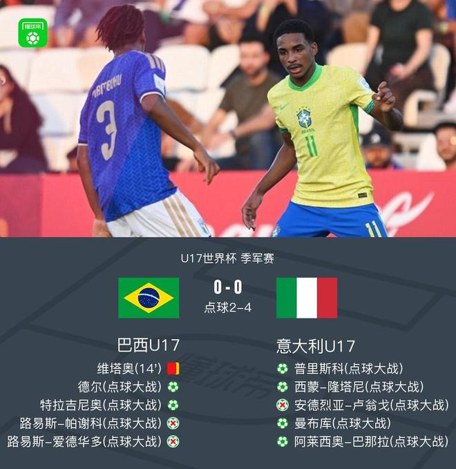 北京时间11月27日,巴西U17与意大利U17在U17世界杯季军争夺战中展开对决。第14分钟,比坦因两张黄牌和一张红牌被罚下场,费利佩·莫赖斯的头球被判无效。常规时间两队打成0-0平,比赛直接进入点球大战。在第五场比赛的点球大战中,巴纳拉攻入致胜一球。最终,意大利U17以4-2击败巴西U17,获得本届U17世界杯第三名。关键比赛第14分钟,维托因中场附近铲球吃到黄牌。两张黄牌被一张红牌取代,他因点球被罚下场。意大利4-2巴西。巴纳拉赢得了第一轮比赛。两队在第二轮比赛中均取得进球。第三轮比赛,两队均取得进球。两人都缺席了第四轮。巴西队无缘第五轮。巴纳拉进球。比赛最后4分钟,意大利U17在进攻区发起进攻。斯特凡诺尼左侧射门偏出。第14分钟,维托中场附近射门吃到黄牌。两张黄牌变成红牌,他被罚下场。第32分钟,马里尼威胁远射高出横梁。第34分钟,意大利队前场协调射门,马卡罗尼的射门偏出。第65分钟,费利佩·莫赖斯头球破门。裁判看了VAR后判定进球无效。第68分钟,坎帕尼洛禁区内倒地。主裁在查看VAR后并未判罚点球。第77分钟,坎帕尼洛踩踏了费利佩·莫赖斯。在斯里兰卡,裁判在看到VAR后出示了黄牌。第90分钟,点球大战意大利4-2巴西。巴纳拉赢得了第一轮比赛。两队在第二轮比赛中均取得进球。第三轮比赛,两队均取得进球。两人都缺席了第四轮。巴西队错过了第五届rvibe。巴纳拉点球得分。末节球队阵容技术统计电子比赛