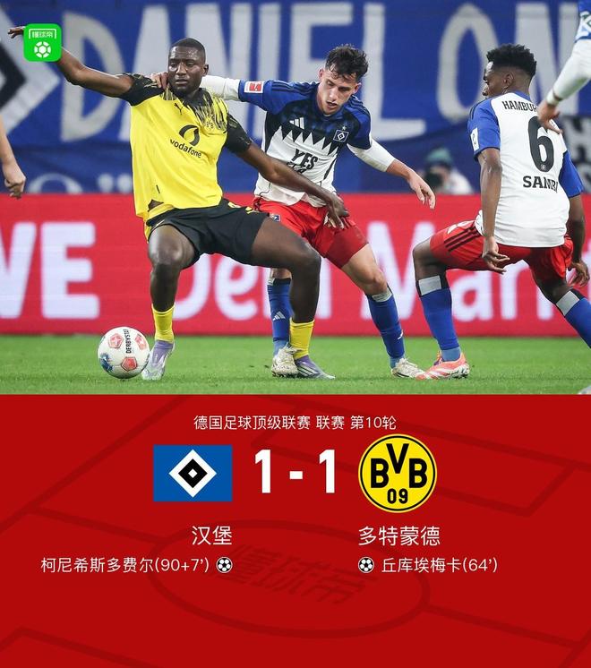 北京时间11月8日,2025-2026赛季德国足球甲级联赛第10轮比赛,汉堡主场迎战多特蒙德。下半场,施洛特贝克助攻上方射门,楚科维梅卡破门,最后分钟科尼格斯多费尔头球破门。最终,多特蒙德1-1战平汉堡。关键比赛第64分钟,施洛特贝克助攻头球顶射,楚科维梅卡破门,多特蒙德1-0战胜汉堡。第90+7分钟,柯尼格斯多弗最后时刻头球破门,汉堡1-1多特蒙德。两支球队的球员都参加了比赛。第19分钟,楚科维梅卡被侧面撞倒,但裁判没有示意。第20分钟,波尔森远射,但皮球被科贝尔没收。第35分钟,拜尔传球到禁区,楚科维梅卡的射门偏出。第38分钟,卡帕尔多头球破门。目标:巴拉撞到门框并飞走了。在米第45和1分钟,楚库·埃梅卡(Chukwu Emeka)被踢倒在地。裁判没有给出任何指示。施洛特贝克在第49分钟受伤,但在接受治疗后很可能会继续比赛。第71分钟,吉拉西头球攻门,但皮球高出球门。 7' 第6分钟,格拉策尔禁区内射门,但皮球被科贝尔挡出。他被楚库·埃梅卡 (Chukwu Emeka) 换下,埃梅卡在第 81 分钟进球。 N Mega出现了。第83分钟,柯尼格斯多弗禁区内倒地。裁判说没有问题。球队阵容技术统计