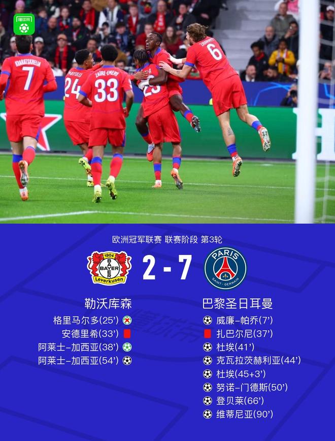 北京时间10月22日,欧冠阶段第三轮勒沃库森对阵巴黎圣日耳曼。上半场,门德斯助攻帕乔头球攻门。扎瓦尼射门击中中柱,格里马尔多主罚点球。安德里奇肘击杜埃,立即被罚下场。扎瓦尼获得红点后,加西亚主罚点球。 KK助攻杜埃的低射破门。 KK继续截击。阿什拉夫击中门柱弹入球门后,助攻杜埃攻入两球。下半场,维西尼亚助攻门德斯破门,格里马尔多助攻加西亚梅开二度,巴克拉助攻登贝莱腹股沟破门,维西尼亚远射破门。最终勒沃库森2-7巴黎圣日耳曼。关键时刻:第7分钟,门德斯传中,帕乔头球破门!勒沃库森0-1巴黎 第25分钟,扎瓦尼包点黄牌。格里马尔多主罚点球击中立柱。第33分钟,安德里奇肘击杜埃。裁判查看VAR后,改判红牌并罚下球。第38分钟,扎瓦尼获得红包。加西亚PK得分!勒沃库森1-1巴黎 第41分钟,杜埃接到KK助攻后低射入网!第44分钟勒沃库森1-2巴黎再次获胜! KK的凌空射门连续击中立柱,被球门吸收。巴黎3-1。第45、3分钟,阿什拉夫送出斜传,杜埃特远射拿下两分。第50分钟,巴黎4-1,维西尼亚送出直传。门德斯的凌空抽射被挡出,但却飞向球门!第54分钟,巴黎5-1,格里马尔多斜传,加西亚远射得分两分。勒沃库森2-5 第66分钟,巴克拉门前送球,登贝莱斜射穿过腹股沟!第90分钟,巴黎6-2,全场第三传球手和射手!维西尼亚完成远射,巴黎7-2勒沃克当两队球员进入球场时。比赛进行到第7分钟,门德斯传中。而帕乔头球破门!勒沃库森0-1巴黎 第18分钟,KK尝试外线远射,但皮球偏出了底线。第25分钟,扎瓦尼吃到黄牌。第29分钟,格里马尔多主罚点球击中立柱。这几乎是一种祝福!第30分钟,马尤尔胸部停球,射门击中立柱。接到回传的波库上前一脚低射,皮球进入边网。第33分钟,安德里奇肘击杜埃。裁判查看VAR后,改判红牌并罚下球。第38分钟,扎瓦尼获得红点,加西亚获得点球!你!勒沃库森1-1巴黎 第41分钟,杜埃接到KK助攻后低射入网!第44分钟勒沃库森1-2巴黎再次获胜! KK的凌空射门击中了球门柱连续并被目标所吸收。巴黎3-1。第45、3分钟,阿什拉夫送出斜传,杜埃特远射拿下两分。第50分钟,巴黎4-1,维西尼亚送出直传。门德斯的凌空抽射被挡出,但却飞向球门!第54分钟,巴黎5-1,格里马尔多斜传,加西亚远射得分两分。勒沃库森2-5。第63分钟,连续两名球员被换下。登贝莱和李·冈伦一起亮相。第66分钟,巴科拉进球。此前,登贝莱小角度射入腹股沟破门。第78分钟,巴黎6-2,尼安图突破防守扣篮低射。第90分钟,弗雷肯获得球权。他是这场比赛的第三传球手和投篮英雄!!维西尼亚远射破门 巴黎7-2勒沃库森 技术统计