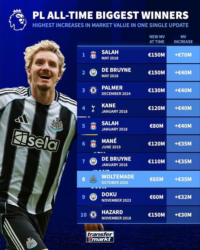 北京时间10月20日,历史性的英超球员单笔身价增幅名单被列入德国转会市场。其中,沃尔特·马德尔以3500万欧元排名第八,而萨拉赫仍然位居榜首。英超历史上单一身价上涨名单: 1. 萨拉赫,2018年5月,从7000万欧元增加到1.5亿欧元 2. 德布劳内,2018年5月,从4000万欧元增加到1.5亿欧元 2. 帕尔默,2024年12月,从4000万欧元增加到1.3亿欧元 2. 凯恩,2018年1月,从100万欧元增加到1.2亿欧元40美元欧元 2. Salah 2018 年 1 月 从 4000 万欧元增加到 8000万欧元 6. 马内 2019年6月 从3500万欧元增加到1.2亿欧元 6. 德布劳内 2018年1月 6. 沃尔特 2025年10月 从3500万欧元增加到6500万欧元 9. 杜奥克 2023年11月从3200万欧元增加到6000万欧元 10. 阿扎尔11月将薪水增加3000万欧元至1.5亿欧元2018 [在 MiG 上独家观看英超联赛]